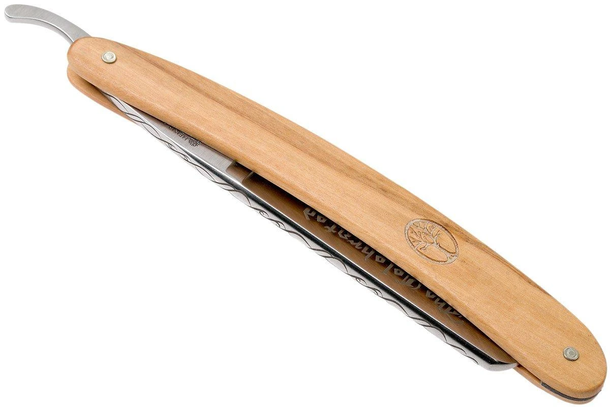 Le Böker Manufaktur the Celebrated, Olive 140327 est un rasoir coupe-choux de la plus haute qualité. La marque Böker s’est forgé une excellente réputation en fabriquant des rasoirs coupe-choux fantastiques depuis plus de 100 ans. Ce rasoir droit est fabriqué dans l’atelier de Böker situé à Solingen en Allemagne. Le dos de la lame arbore une belle gravure en filigrane et le nom du rasoir est inscrit partiellement à la feuille d’or sur la lame. Ce modèle avait été lancé dans le catalogue Böker… En 1906 !