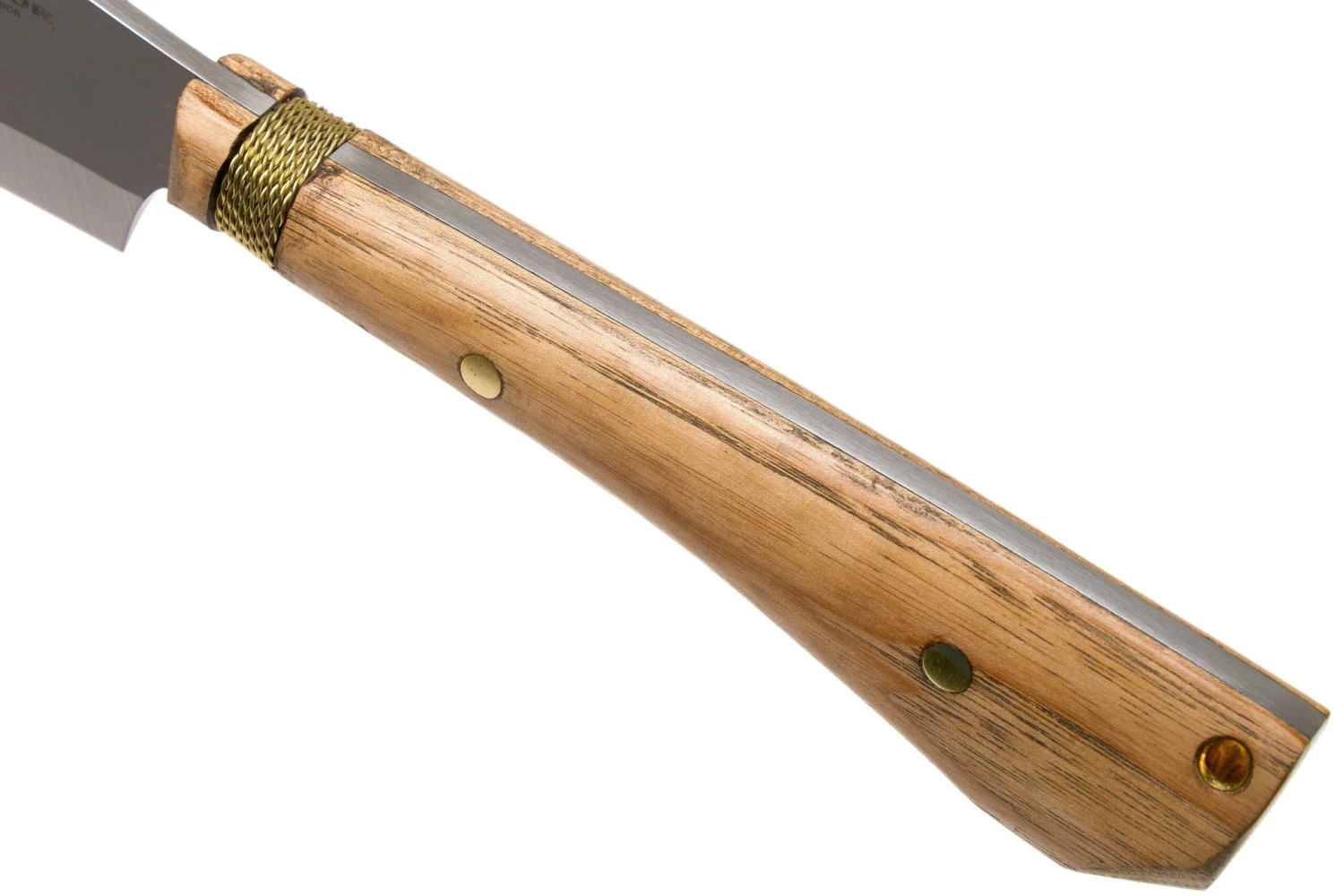 La Condor Batonata Chopper CTK2013-10HC est une grosse machette, conçue par Joe Flowers. Avec une épaisseur de lame de 5 mm, c’est vraiment un beau bébé ! Elle a été conçue pour fendre du bois. C’est donc idéal que le manche soit en hickory américain. Il s’agit d’une essence de bois couramment utilisée pour fabriquer des manches de haches. Bien résistante aux chocs. Tout comme la lame bien épaisse. Pour ce design, Flower s’est inspiré des couteaux japonais Nata. D’où son nom : Batonata. Un Nata fait pour couper des batons.