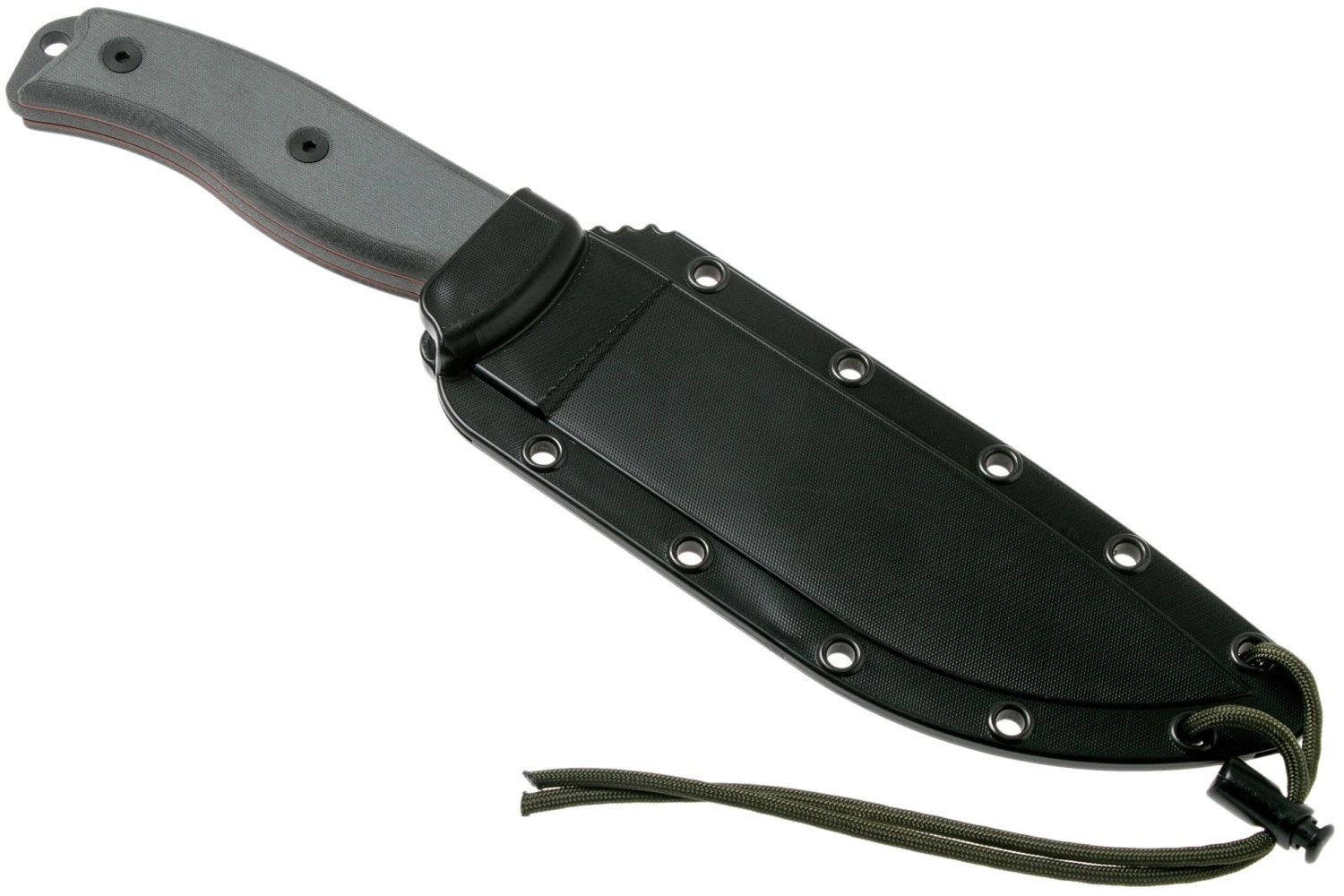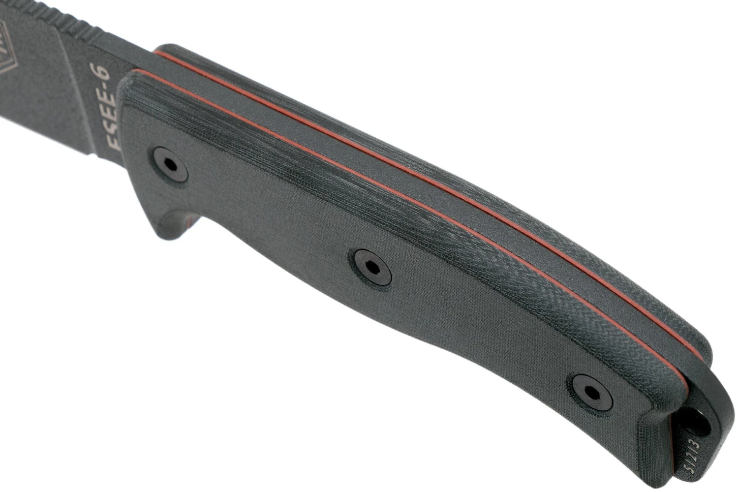 L’ ESEE Model 6 est un couteau de survie solide avec une lame en acier carbone 1095. L’acier carbone n’étant pas résistant à la corrosion, un revêtement poudré est appliqué sur la lame pour une meilleure protection contre la rouille. La grande performance de l’acier garantit un plaisir d’utilisation à vie. La lame full tang est entourée d’un manche en micarta. Ce manche est un peu rugueux au toucher ce qui permet une bonne adhérence et un confort d’utilisation optimal. L’ESEE Model 6 est un couteau grand et solide qui est fait pour une utilisation intensive. Avec un poids de 335 grammes, il est relativement lourd.